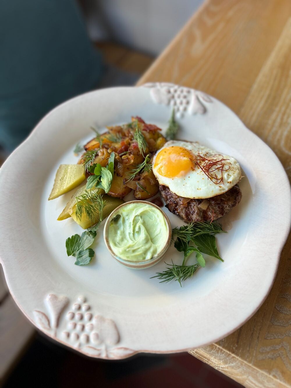 Бифштекс рубленный с яйцом, жареным луком и картофелем по-деревенски