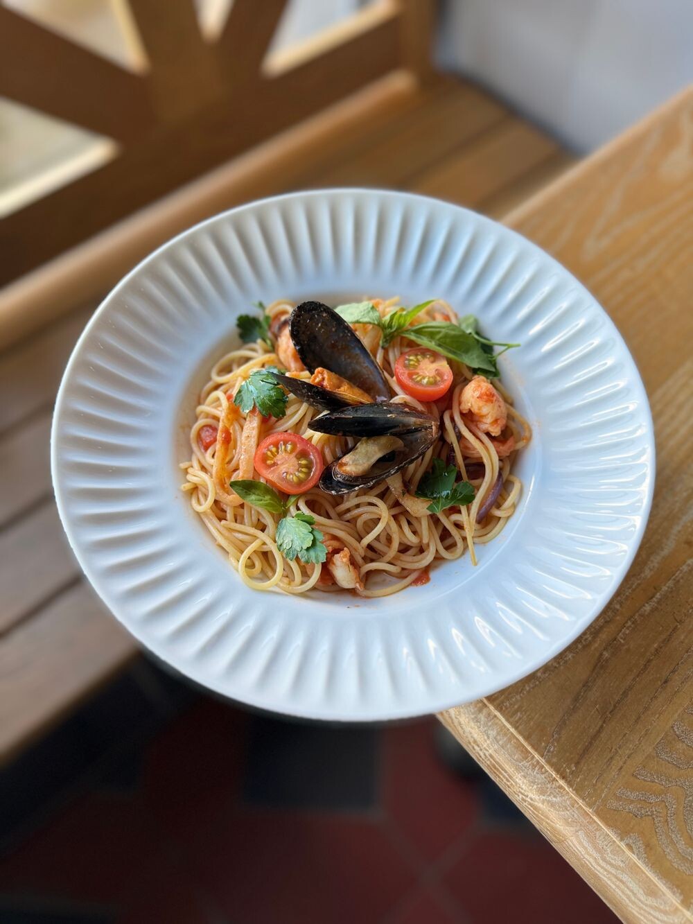 Паста с морепродуктами в томатном соусе и свежим базиликом
