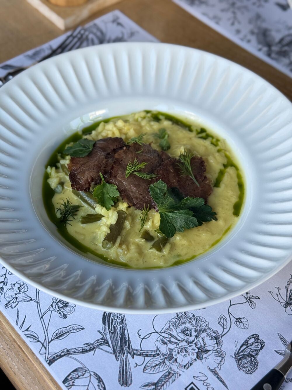 Ризотто с копченым ростбифом, выдержанным сыром и зеленым маслом